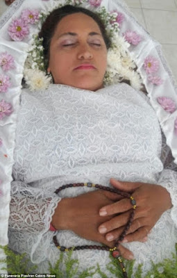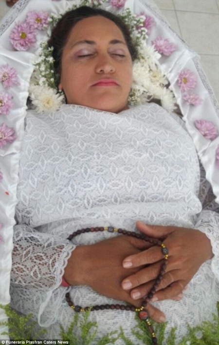 Dailymail reports that Vera Lucia da Silva, 44, arranged to carry out her bizarre wish to lie in a coffin all day while family and friends pretended she was dead.